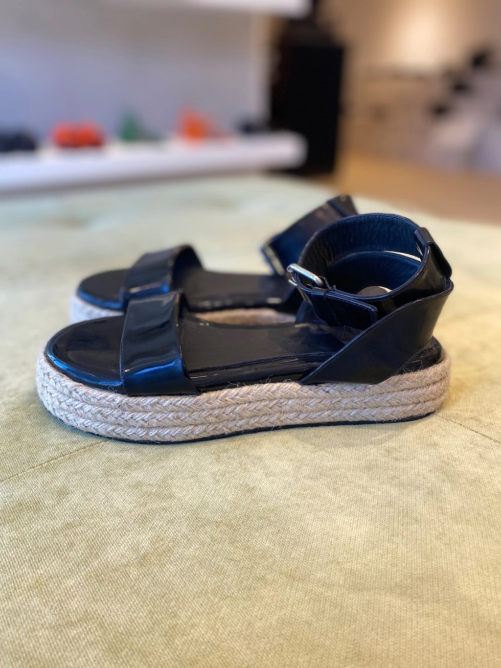 Sandalia realizada en cuero charol negro. Esta forrada en cuero vacuno y tiene una base forrada en yuta de 3 cm de altura.