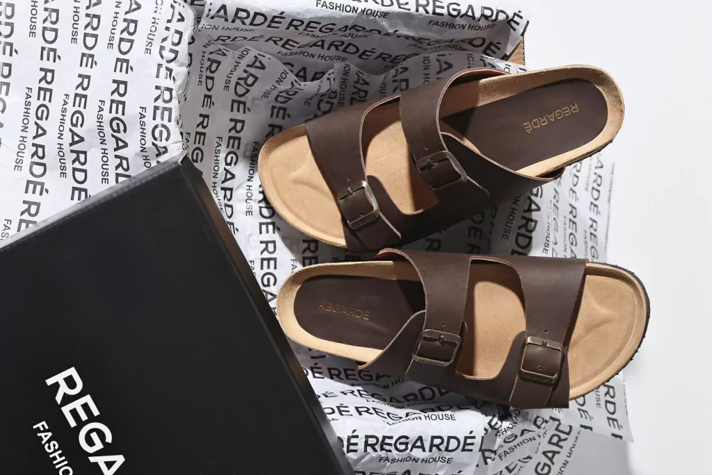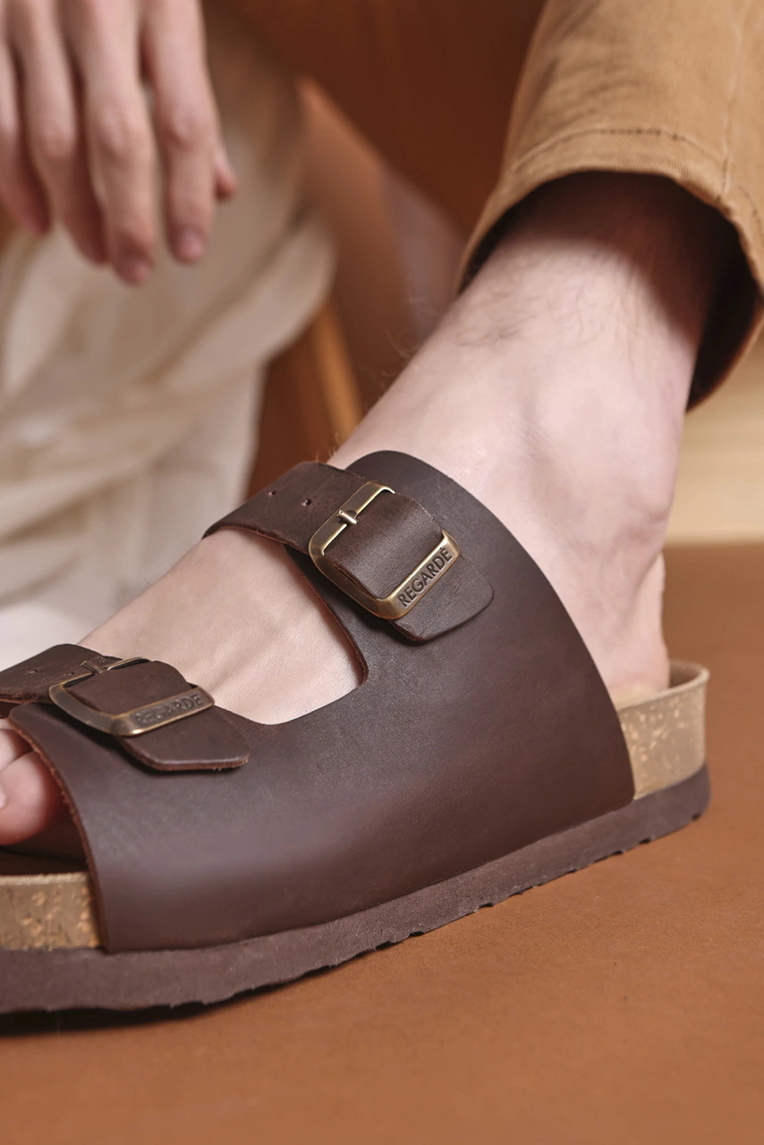 - Detalle de hebillas bañadas en bronce gastado con el logo de la marca
